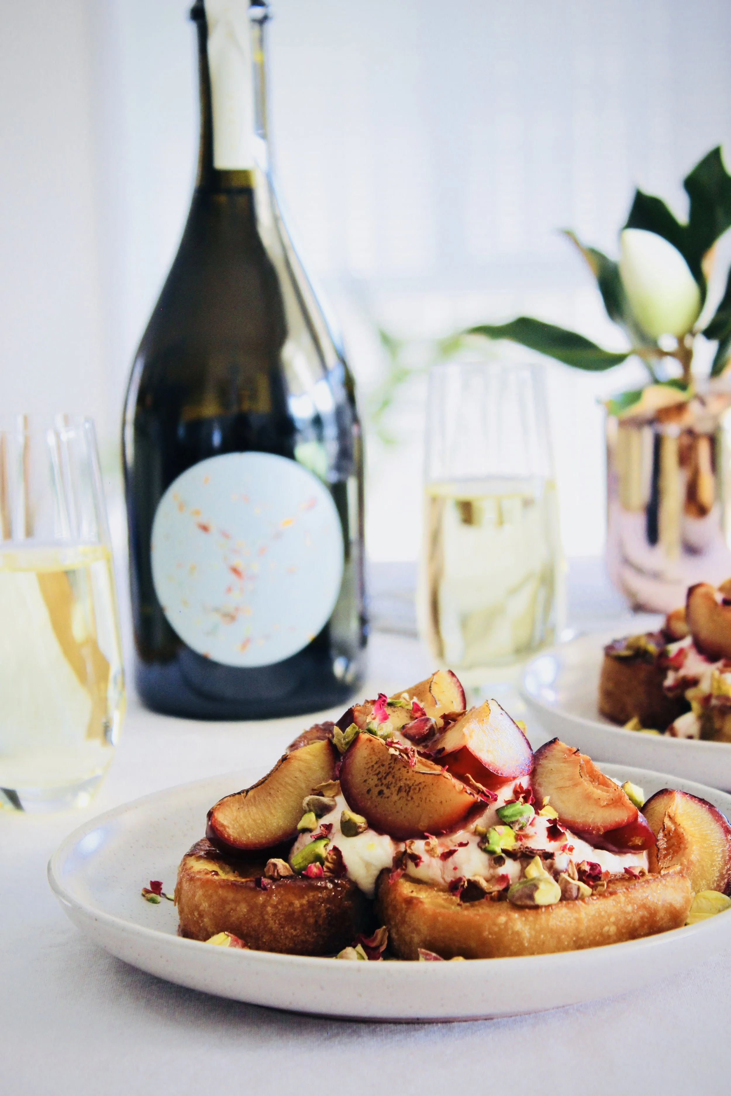 Caramelised French Toast with Roasted Plums, Orange Blossom Labneh & Pistachios