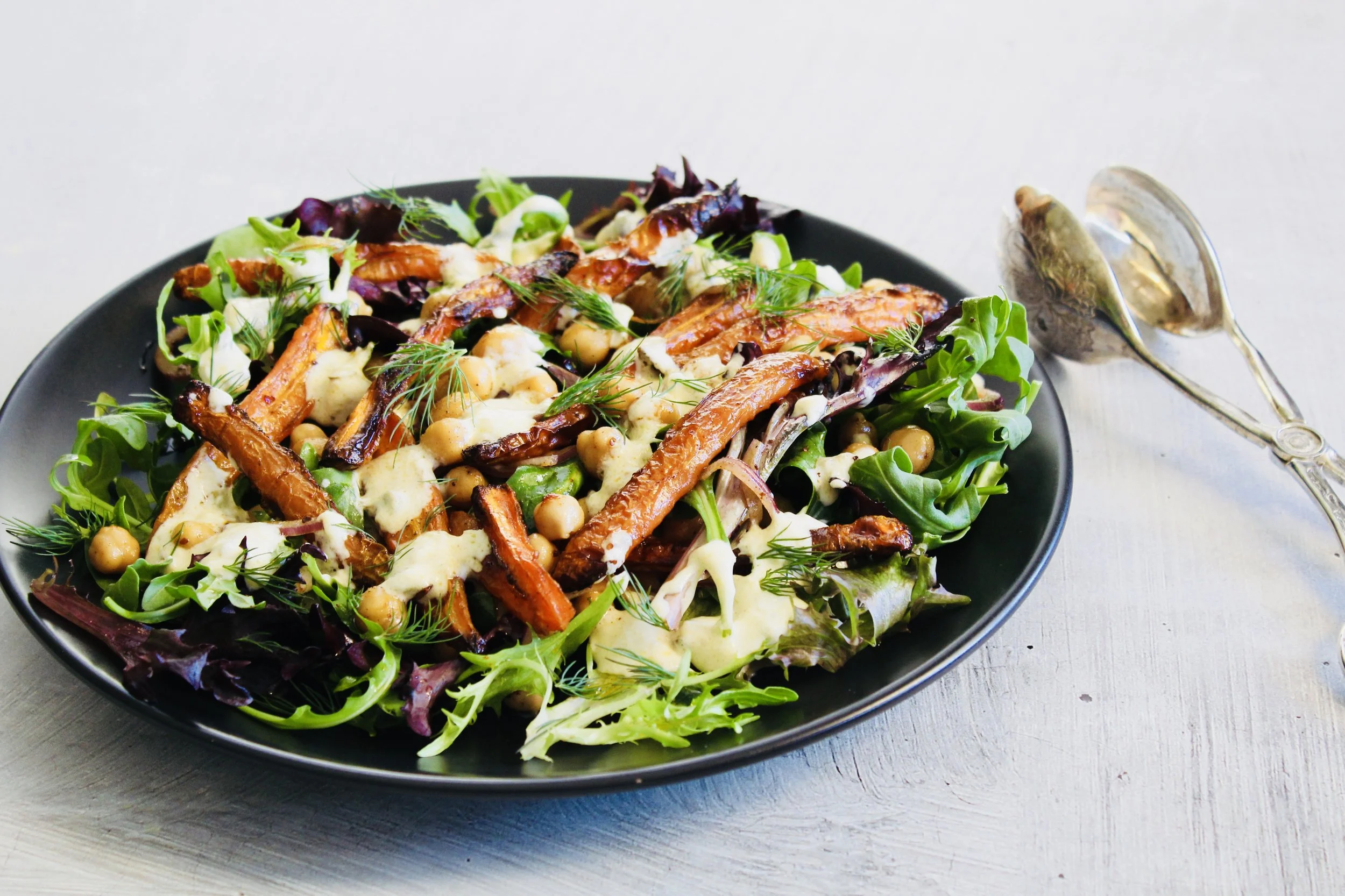 Roasted Carrot & Chickpea Salad with Yoghurt Caper Dressing