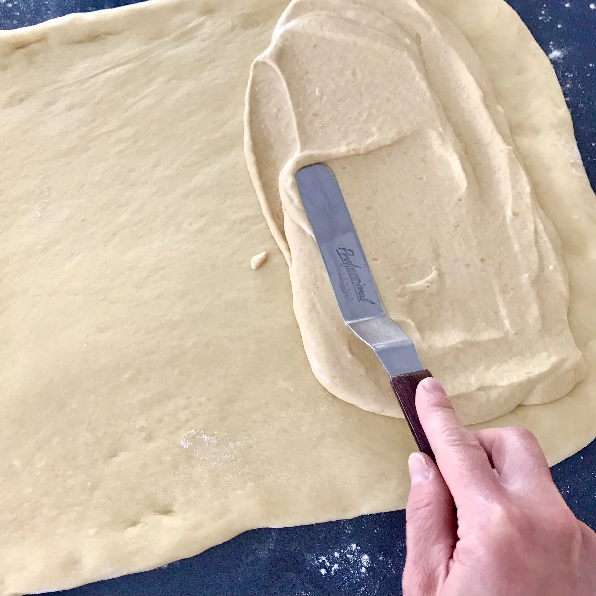 Tip your dough bowl (which should have almost doubled in size by now) onto a lightly floured bench and roll out into a rectangle around 1cm thick.