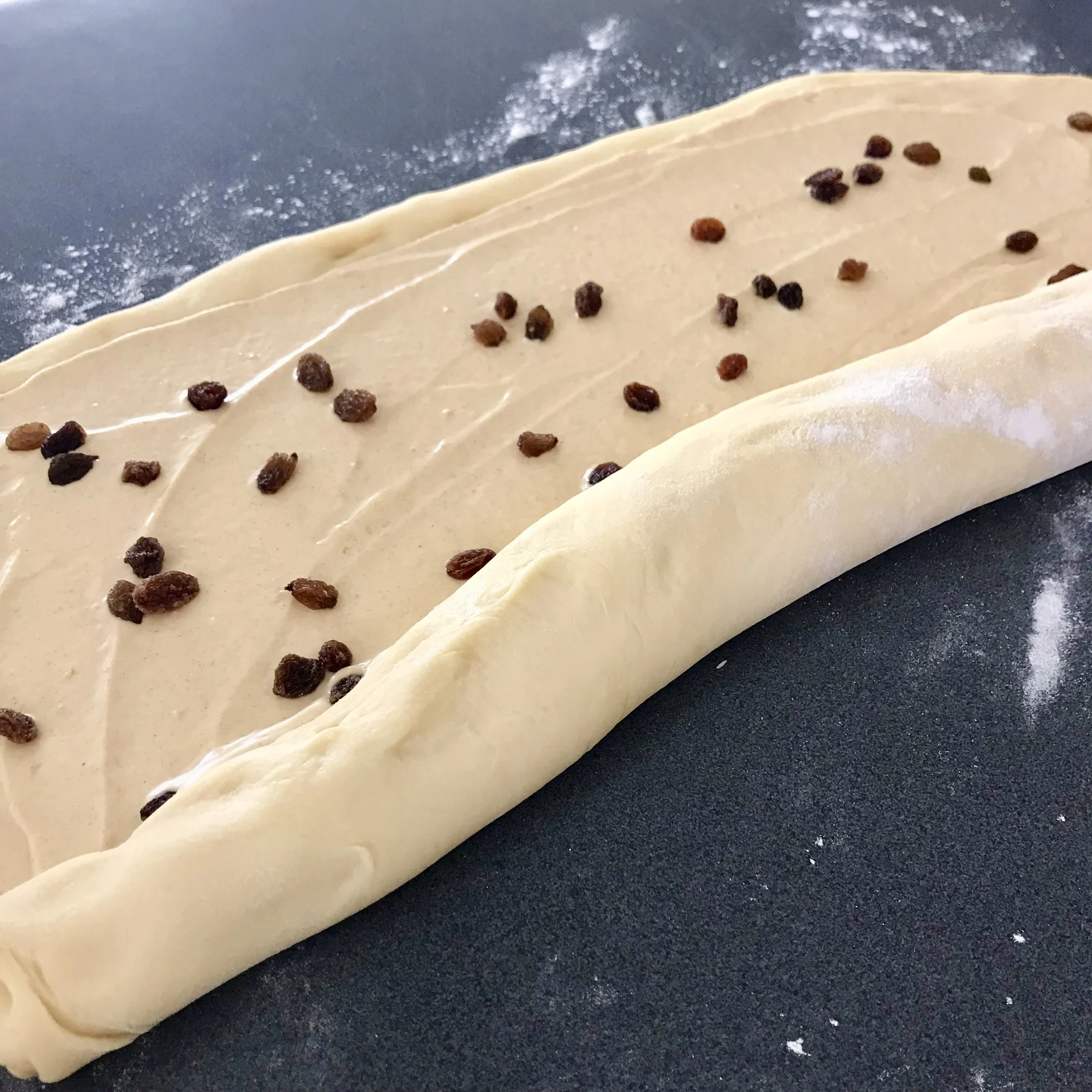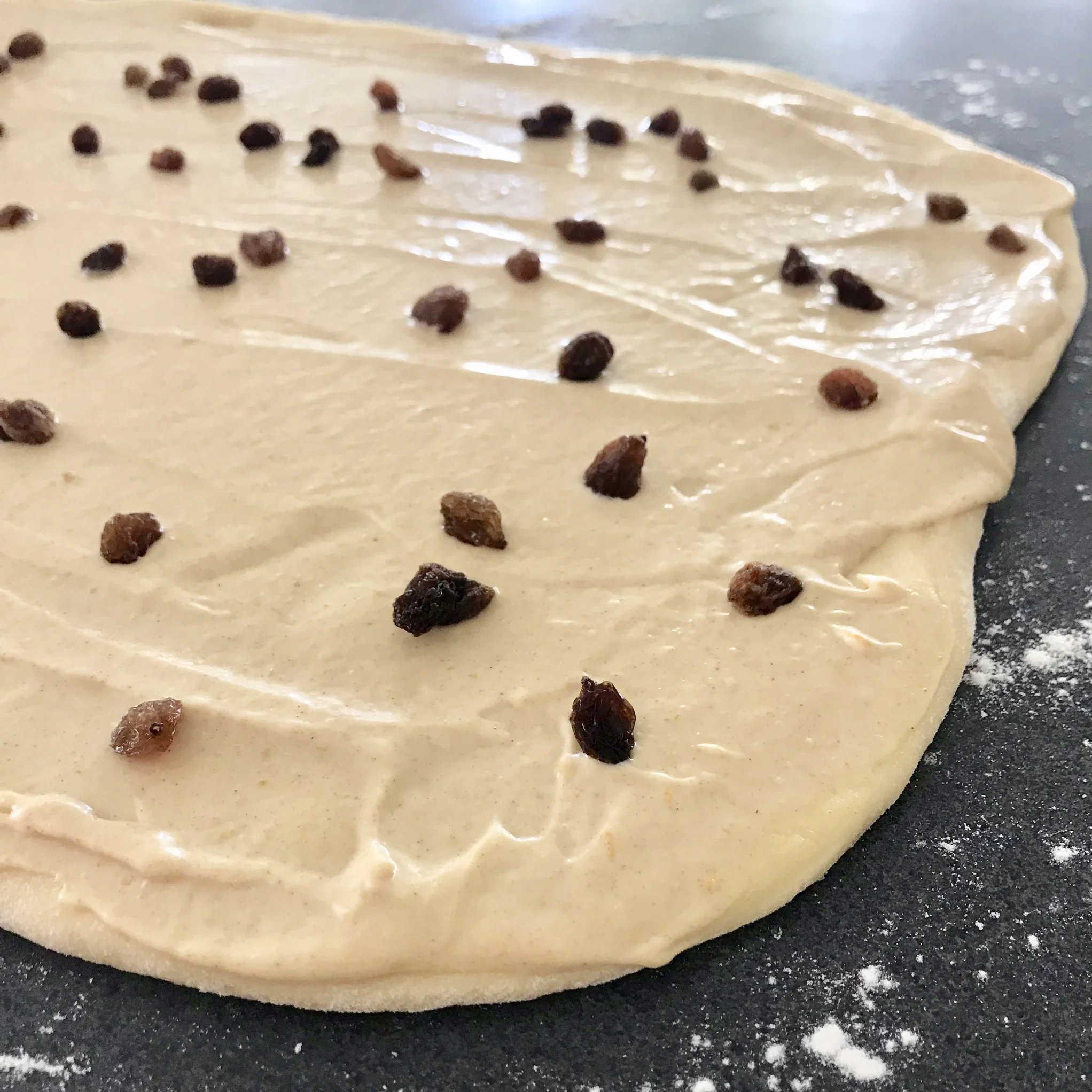 Using a spatula, spread your cream cheese filling all over the rectangle leaving a 1cm edge on the long, far side of the rectangle. Sprinkle evenly with sultanas.