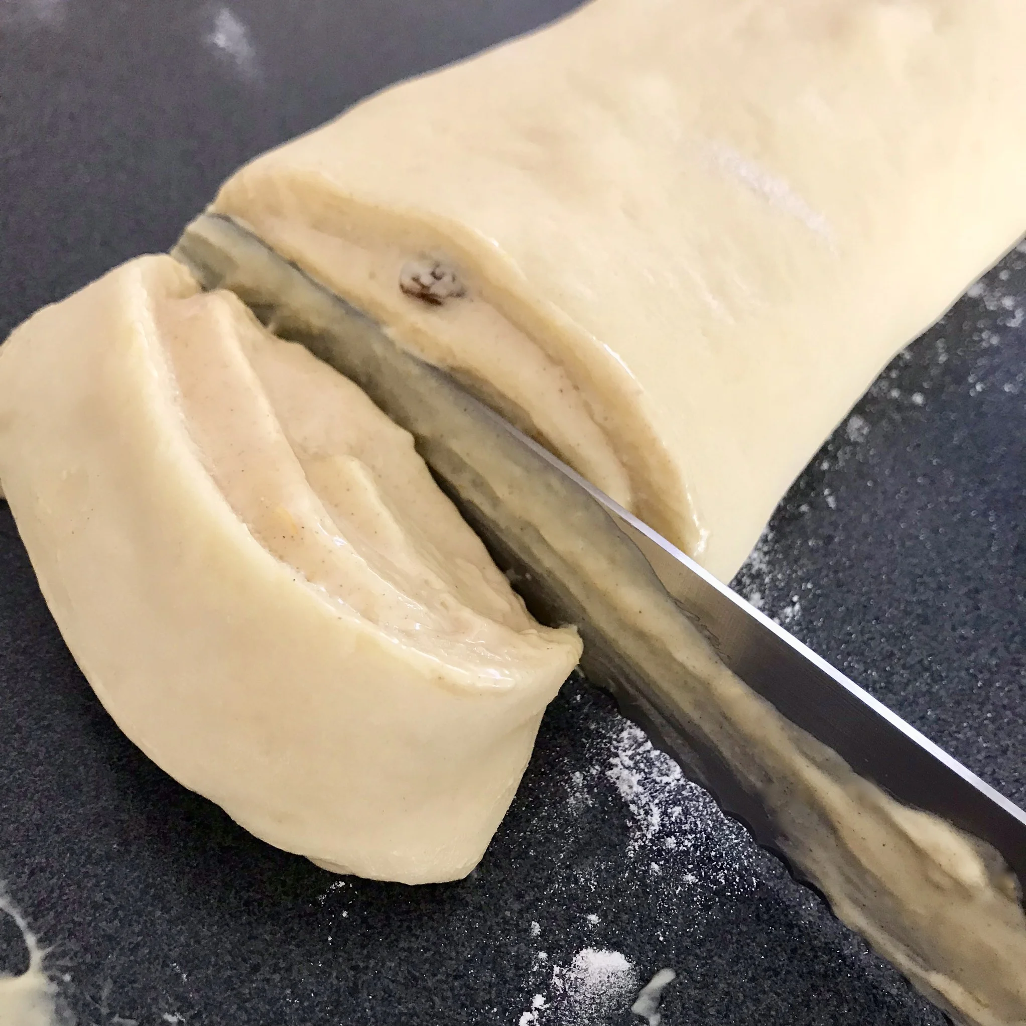 Using a bread knife and a gentle ‘sawing’ motion, cut the roll into 2cm thick slices and place cut side down onto a lined baking tray.