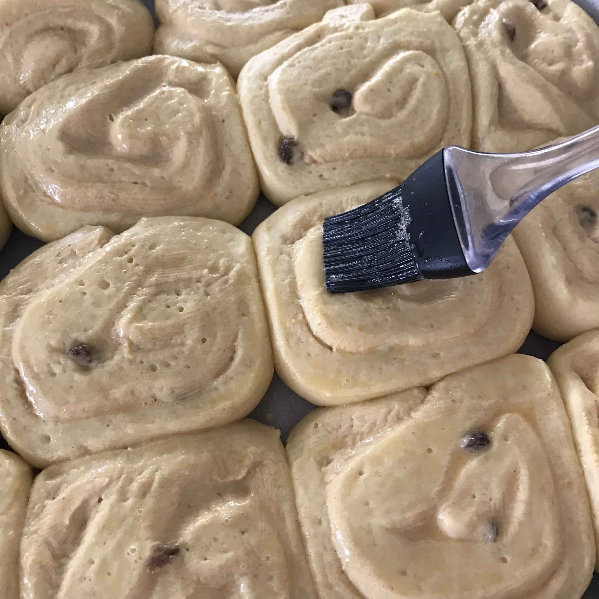 After an hour, preheat the oven to 180C. Beat the extra egg until well mixed and gently brush the egg wash over the buns. Bake for approx 25 mins until golden brown.