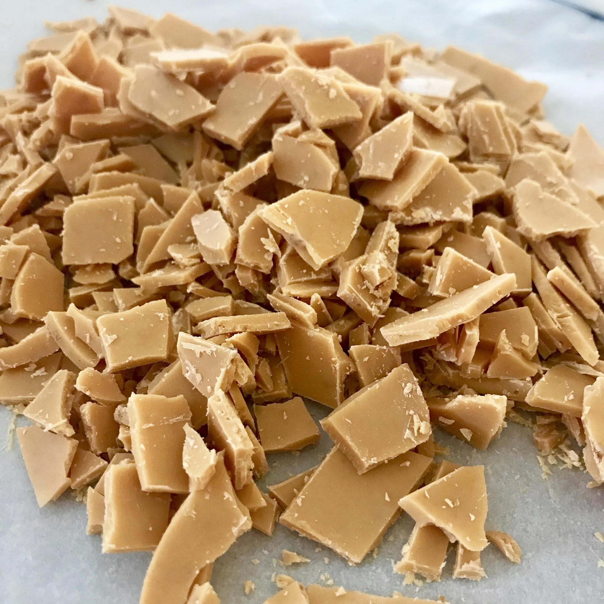 Once the chocolate has caramelised (regardless of what method you have used), pour the chocolate out onto a baking tray lined with baking paper and spread it out so that is around 4mm thick. Refrigerate until set and then cut into choc chip sized chunks.